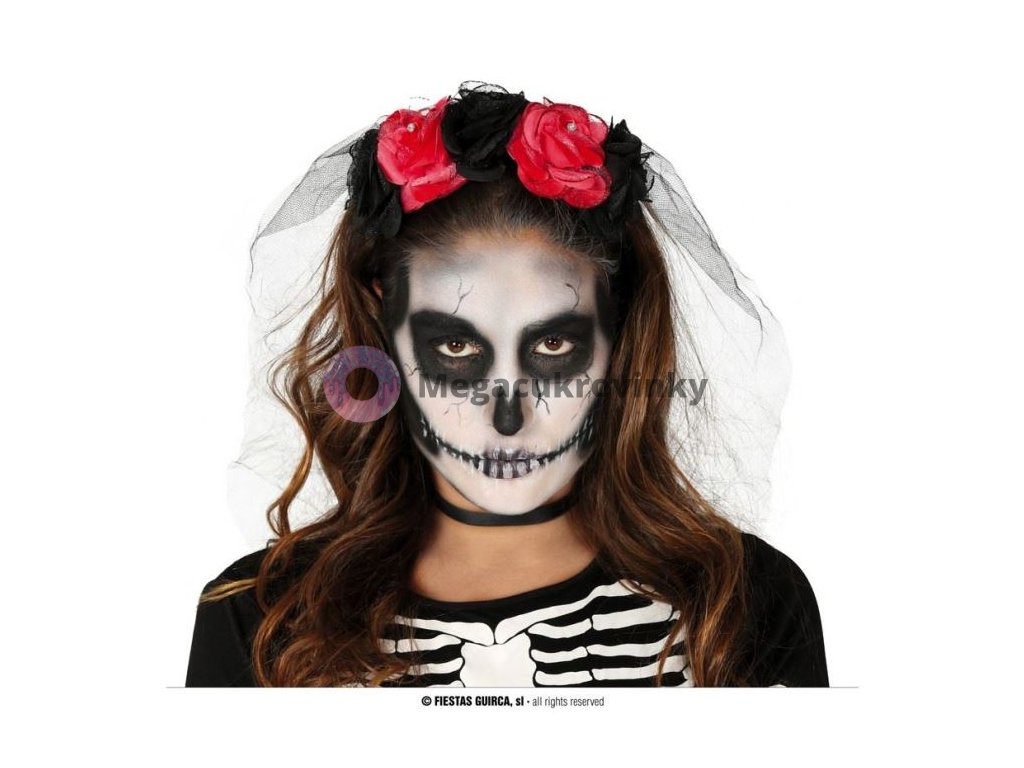 Černý závoj s lebkou dvěmi červenými a třemi černými růžemi vkusně doplní váš karnevalový kostým Srdcové dámy, černé vdovy a pod při příležitosti Halloweenu, karnevalových slavností, stužkovacích večírků nebo maškarních párty.Doplňkové parametry