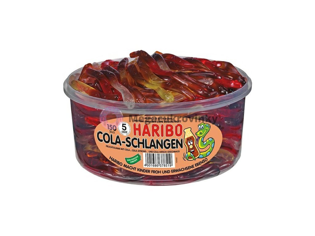 Pokud jsou gumové bonbónky ve tvarů hadů, žížal či housesek Vaše oblíbené, pak Vás jistě zaujmou i tyhle od Haribo! Gumoví hadi s příchutí coly, kombinace coly a citrónu a kombinace coly a třešní ve velké praktické dóze. Užijte si lahodnou chuť coly, a to buď samostatně, nebo ve spojení s ovocem! Tato šťavnatá pochoutka je ideální na dětské oslavy či jen tak na doma u televize!