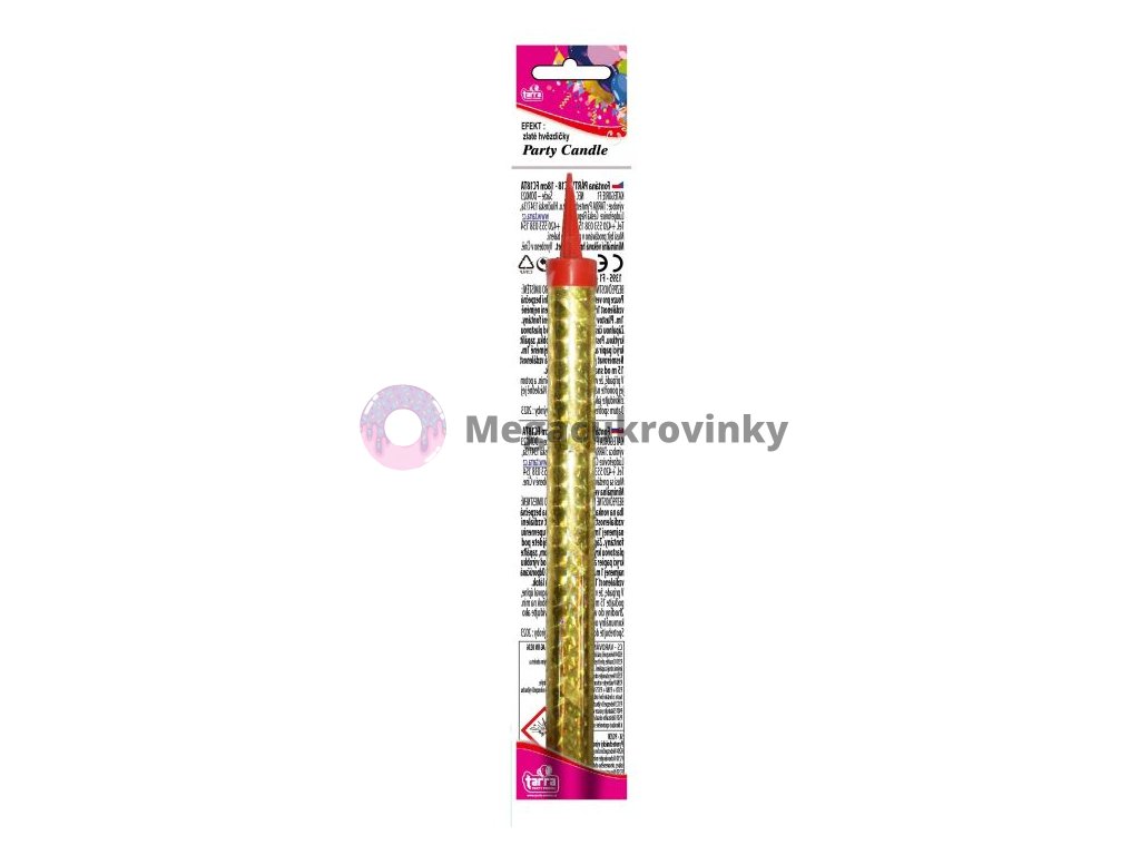 Jedno balení obsahuje 1 kus zlaté párty fontány o délce 18 cm. Žádná párty se neobejde bez této párty fontány! Párty fontána dokonale nahradí svíčky na dortu. Pomocí plastového podstavce snadno a bezpečně zapíchnete do dortu. Fontánka po zapálení prská jako prskavka což vytváří nezapomenutelný efekt pro předávání sladké dobroty oslavenci. Délka trvání efektu: 60 sec. KAT F1 – prodej od 15 let.CLP - Třída nebezpečnosti