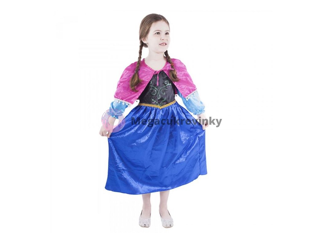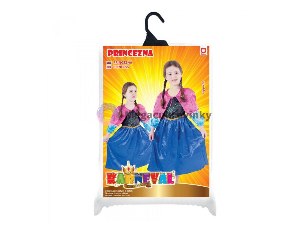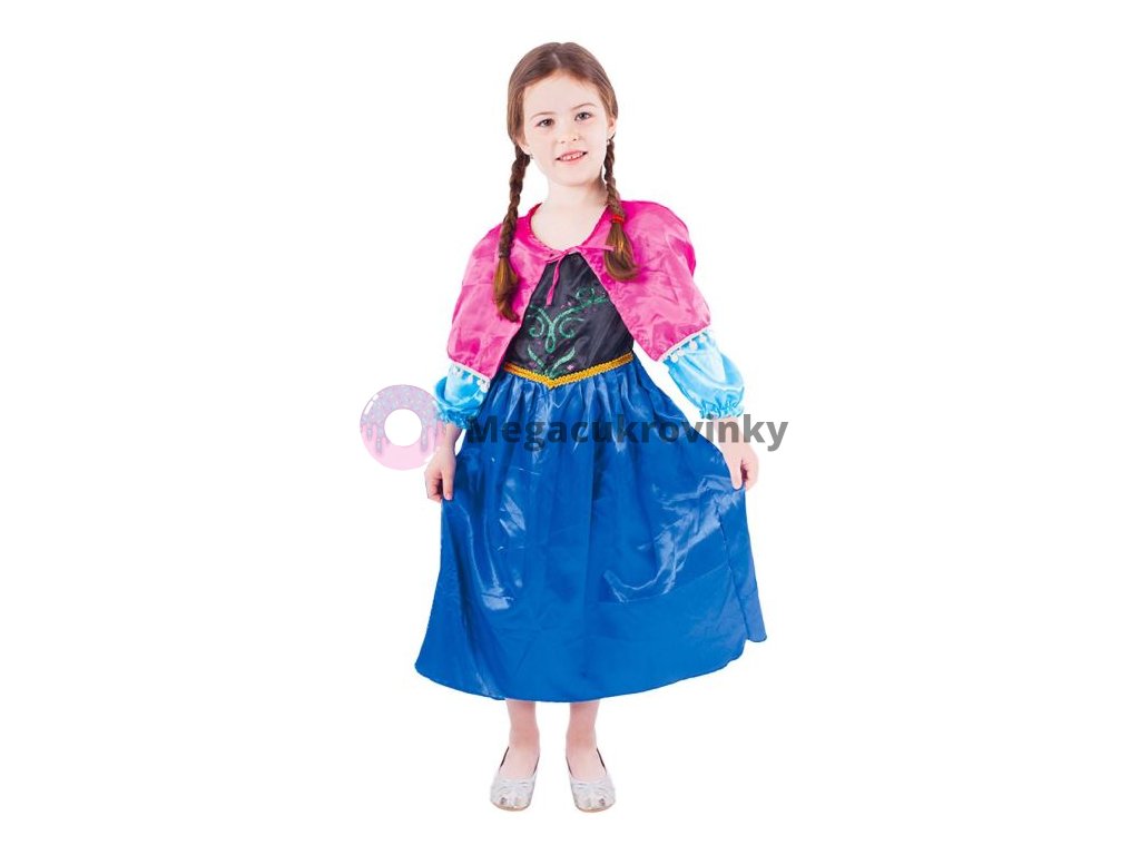 Překrásný dívčí kostým pro všechny sněhové princezny! Kostým ve velikosti M je určen pro holčičky ve věkovém rozmezí 6-8 let (110-128 cm). Velikost se může lišit od vyobrazení na obalu. Kostýmek je ušit v černo-modrých barvách, v horní části je zdoben potiskem, zlatým lemováním kolem pasu. Součástí je také růžový plášť na mašličku.Podrobné informace o produktu získáte kliknutím .