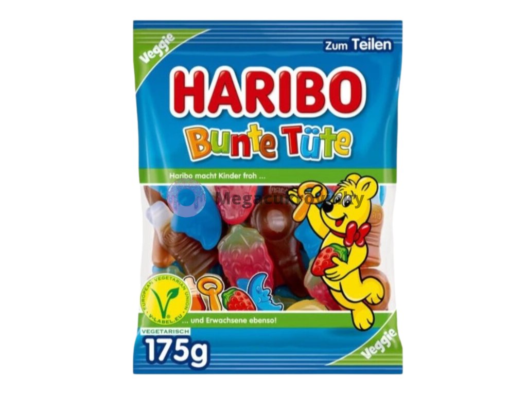 Haribo Bunte Tüte je mix oblíbených gumových bonbónů, který přináší pestrou škálu chutí a tvarů ( jahody, láhve s colou, měsíc) v jednom balení. Tento produkt od známé značky Haribo je ideální pro všechny, kteří milují rozmanitost a chtějí si dopřát to nejlepší z Haribo sortimentu.