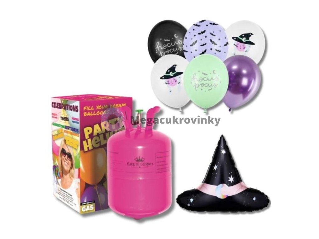 Oslavte Čarodějnickou párty s balónky nafouknutými heliem. Sada obsahuje: - 1 ks jednorázovou tlakovou nádobu o vodním objemu 5 l, obsahuje 140 l stlačeného helia - 1 ks foliový balónek klobouk - čarodějnice - 60 cm - 6 ks latexových mix balonků s potiskem Hocus pocus - 30 cm v barevném provedení Foto heliové bomby je pouze ilustrační.Doplňkové parametry