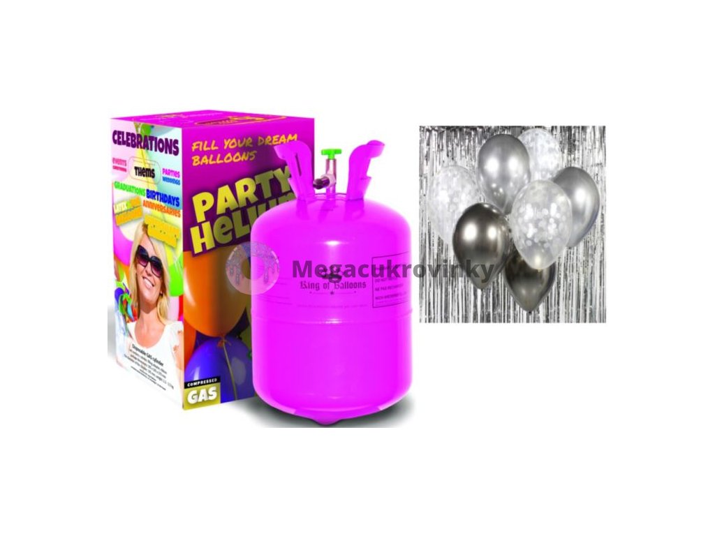 SADA HELIUM + SADA LATEXOVÝCH BALÓNKŮ - chromovaná stříbrná 7 ks, 30 cm. Sada obsahuje HELIUM DO BALÓNKŮ KING OF BALLOONS – jednorázovou tlakovou nádobu o vodním objemu 5 l, obsahuje 140 l stlačeného helia + sadu latexových balónků 2x chromovaný balónek vesmírně šedý 30 cm, 2x chromovaný balónek stříbrný 30 cm, 3x průhledný balónek s konfetovým potiskem 30 cm. Hmotnost láhve je 1,75 kg, výška 310 mm. Helium KING OF BALLONS obsahuje 99 % čistého helia. Nádoba KING OF BALLOONS je uzavíratelná. Obsah nádoby může být skladován nejméně po dobu 6 měsíců, pokud je ventil nádoby plně uzavřen. Foto heliové bomby je pouze ilustrační.Doplňkové parametry