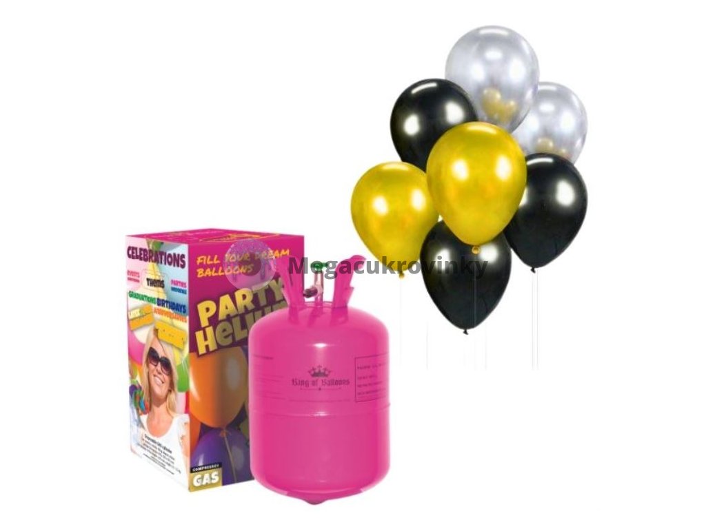 Helium a sada latex. balónků - chrom. zlatá, stříbrná, černá 7 ks - 30 cm