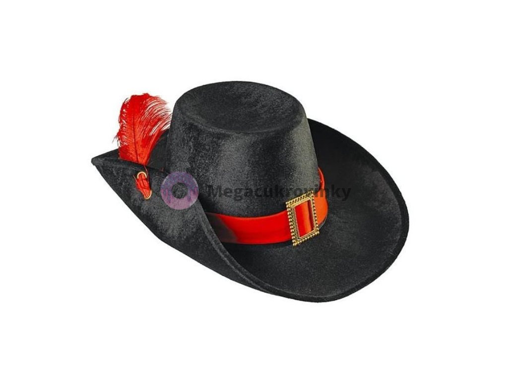 Černý klobouk mušketýra se zlatou přeskou, s červenou stuhou a pírkem. Délka: 40 cm Šířka: 31 cm Obvod hlavy: cm Výška: 12,5 cm Materiál: filcDoplňkové parametry