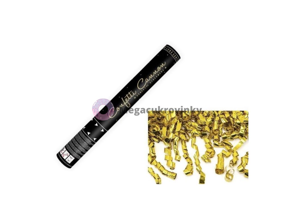 Konfety 40 cm, zlaté metalické stužky 1m dlouhé. Konfety jsou uloženy ve válcovité tubě. Drží se v ruce a ovládají se mechanickým pootočením tubusu. Po vystřelení vyletí zlaté metalické stužky do výšky 5 až 8 metrů a rozptýlí se do okolí. Iniciace: stlačený vzduch Tubus: kov Manipulace: pootočení Max délka odpálení: 8 m Bezpečnost: konfety lze použít ve venkovních i vnitřních prostorách. Bezpečná vzdálenost přihlížejících diváků od tuby konfet je 10 metrůDoplňkové parametry
