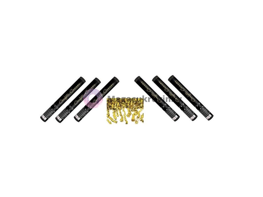 Konfety 40 cm, zlaté metalické stužky 1 m dlouhé. Konfety jsou uloženy ve válcovité tubě. Drží se v ruce a ovládají se mechanickým pootočením tubusu. Po vystřelení vyletí zlaté metalické stužky do výšky 5 až 8 metrů a rozptýlí se do okolí. Iniciace: stlačený vzduch Tubus: kov Manipulace: pootočení Max délka odpálení: 8 m Bezpečnost: konfety lze použít ve venkovních i vnitřních prostorách. Bezpečná vzdálenost přihlížejících diváků od tuby konfet je 10 metrůDoplňkové parametry