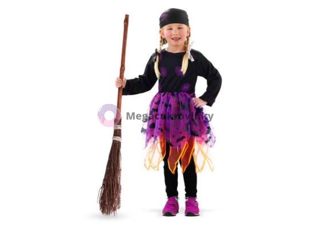 Dětský karnevalový kostým čarodějnice v černo-fialovém provedení, zdobený pavučinkou s netopýry. Ve velikosti S je určen pro holčičky ve věkovém rozmezí 3-5 let (98-116 cm). Součástí balení jsou šaty a šátek.Doplňkové parametry