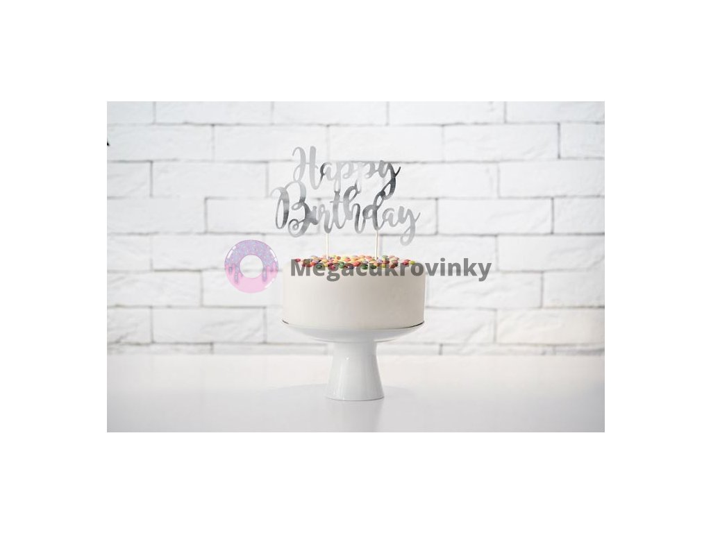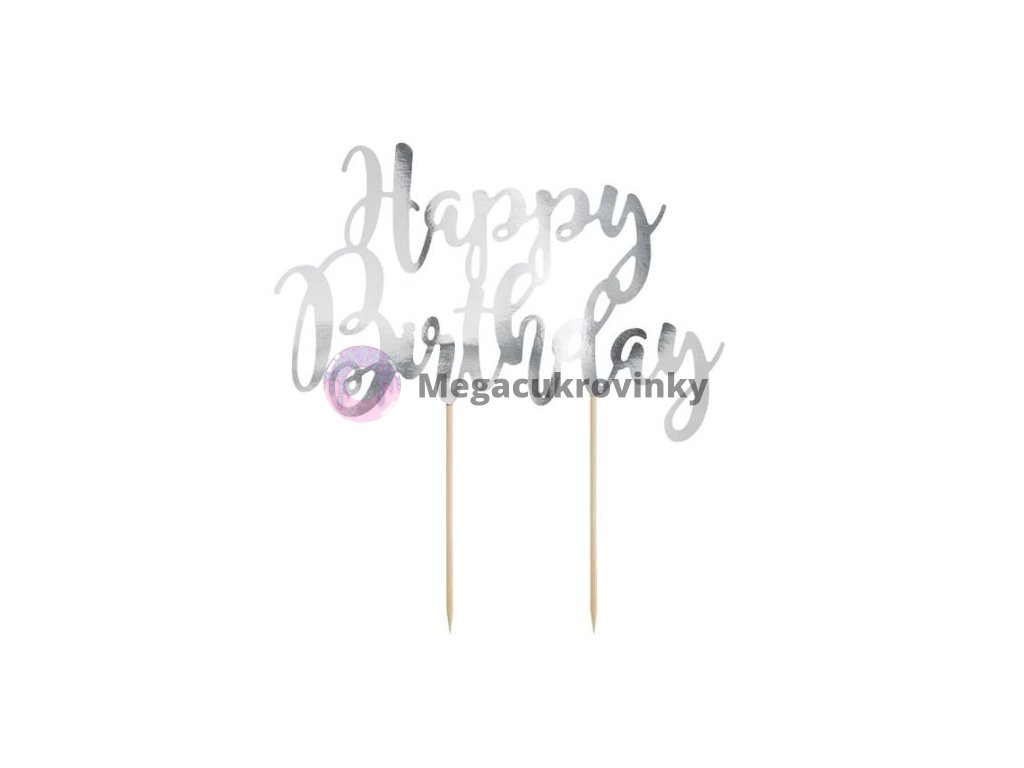 Dekorace - zápich na dort Happy Birthday - narozeniny - stříbrná - 22,5 cm