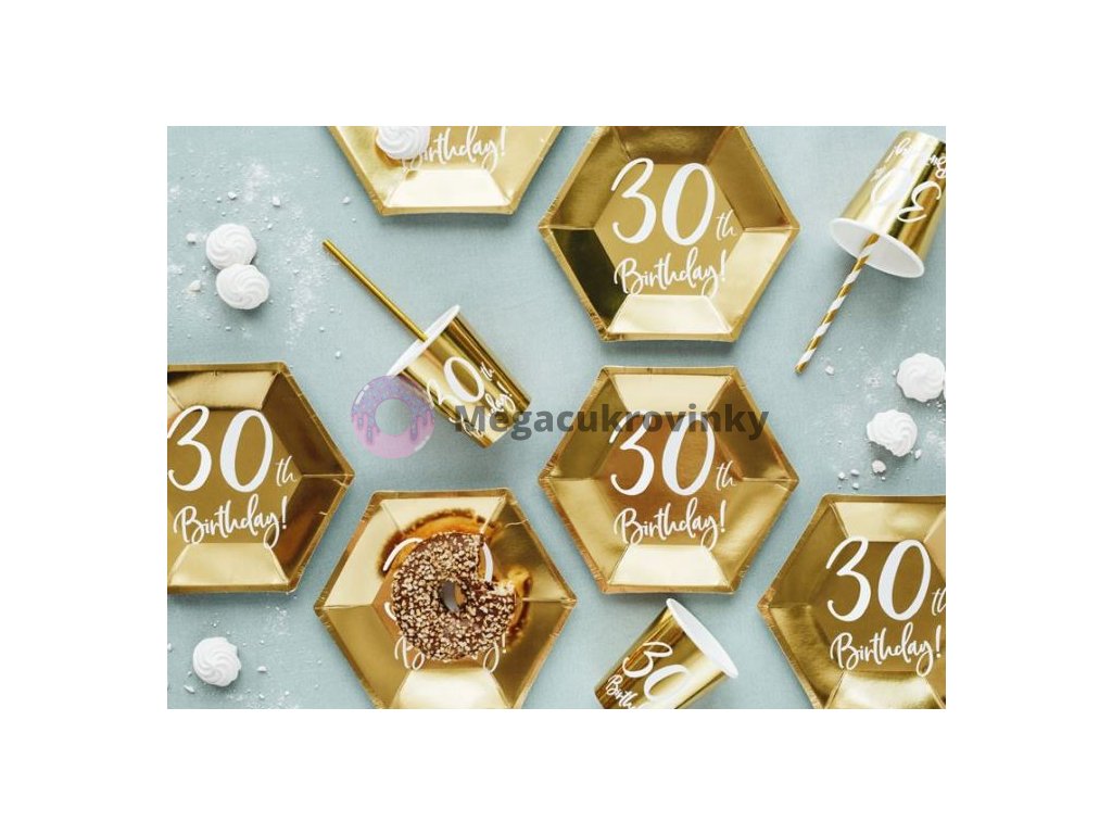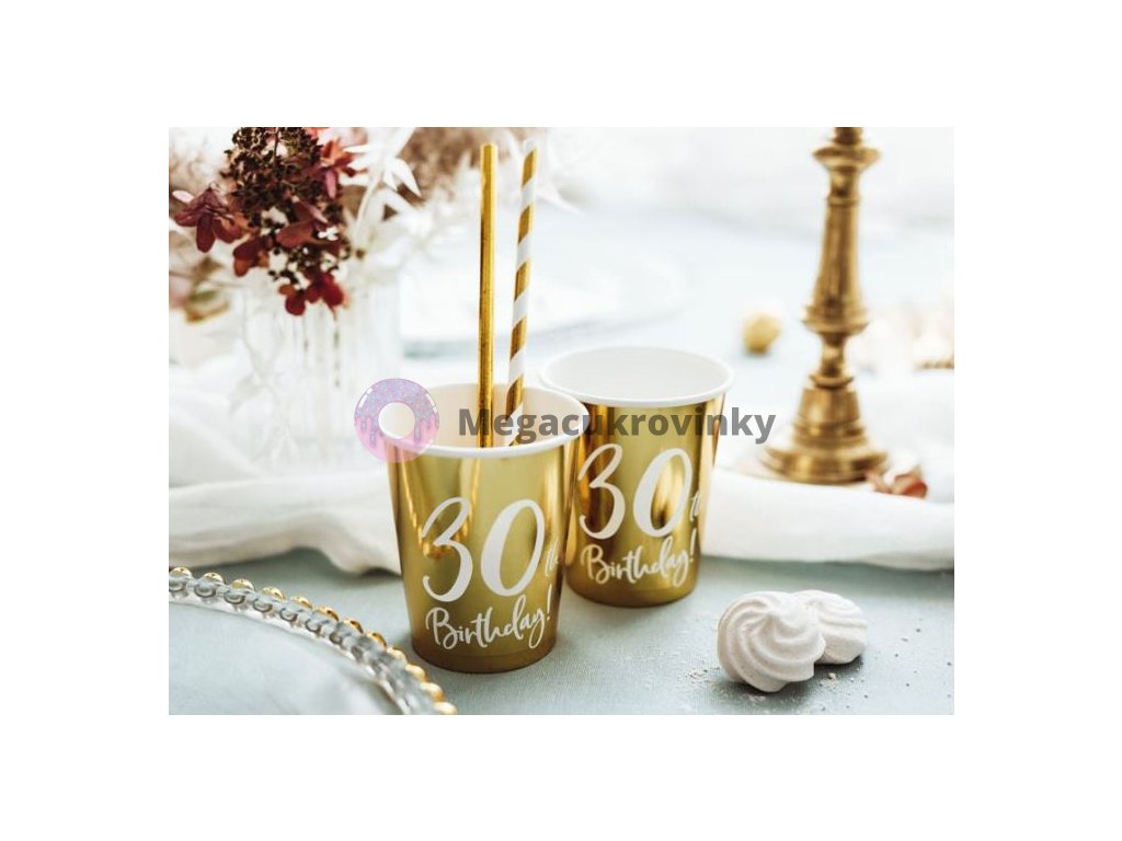 Papírové kelímky ve zlatém lesklém provedení s bílým nápisem „30th Birthday“. Krásný dekorační a praktický doplněk na narozeninovou oslavu. Balení obsahuje 6 ks, 220 mlDoplňkové parametry