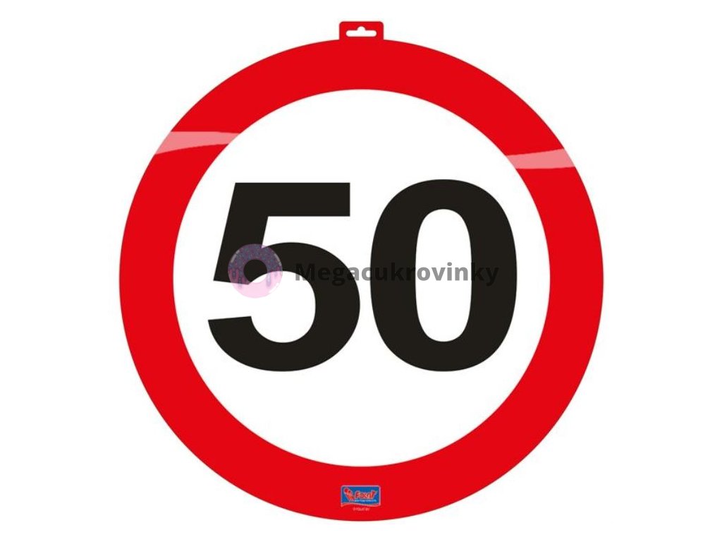 Originální a vtipná výzdoba k 50. narozeninám v designu dopravní značky. Dopravní značka je vyrobena z ohebného plastu a její průměr je 48 cm. Značka má v horní částí oko k zavěšení nebo ji můžete jednoduše pomocí lepicí pásky nalepit například na dveře.Doplňkové parametry
