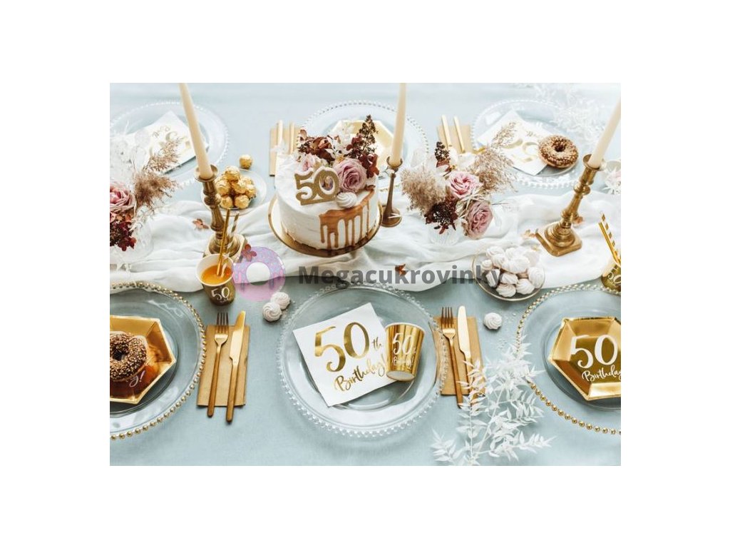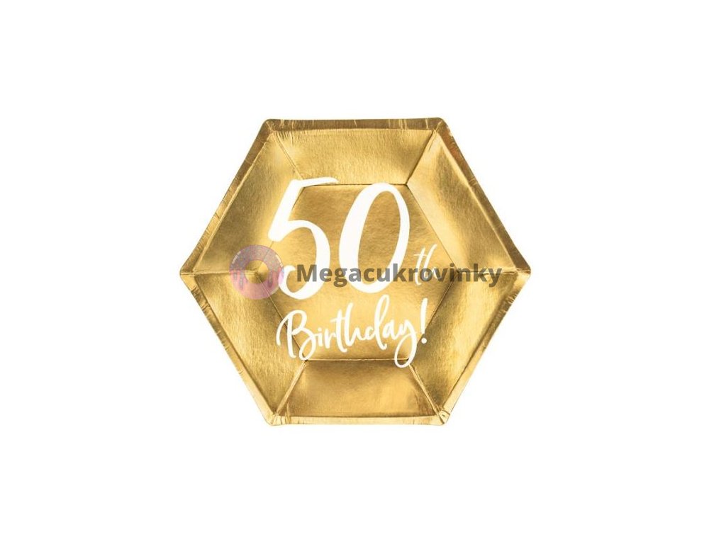 Papírové talíře ve zlatém lesklém provedení s bílým nápisem "50th Birthday". Krásný dekorační a praktický doplněk na narozeninovou oslavu. Rozměry 20 x 17 cm Balení obsahuje 6ksDoplňkové parametry