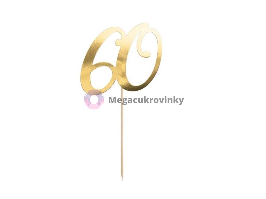 Elegantní zapichovací dekorace na dort se zlatým číslem "60". Tímto zlatým zápichem do dortu doplníte narozeninovou party velice jednoduše a rychle. Ozdoba je vyrobena ze zrcadlového zlatého papíru na dřevěné tyčce. Výška zápichu je 20,5 cm.Doplňkové parametry
