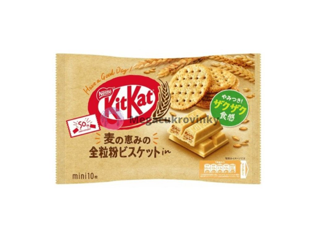 KitKat Wafer Bar with Whole Wheat Flour je inovativní varianta oblíbené čokoládové tyčinky KitKat, která přináší zdravější přístup díky použití celozrnné pšeničné mouky. Tyčinka kombinuje křupavé oplatky s lahodnou bílou čokoládou.