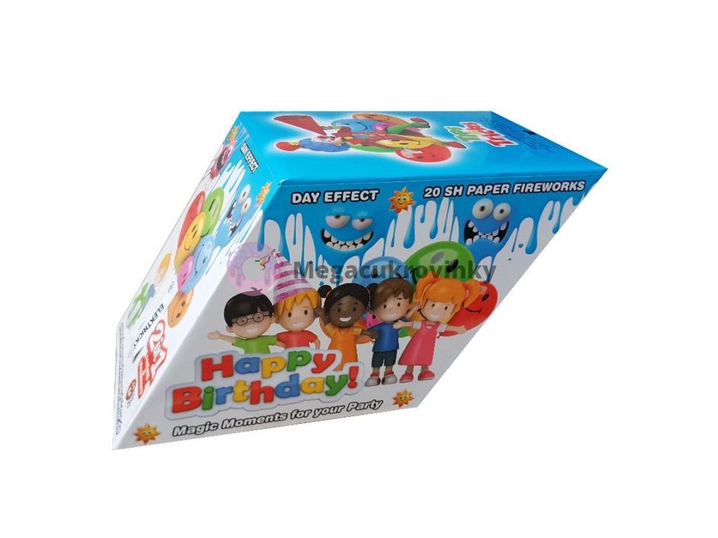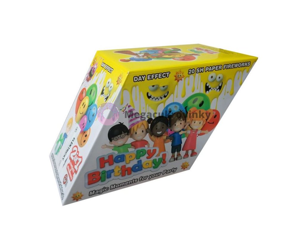 Konfetový ohňostroj 12 ran HAPPY BIRTHDAY – KONFETY a STUHYMix barev: bílé, tyrkysové, červené, žluté, modré, fialové a růžové stuhy. Dlouhé barevné stuhy.Délka stuh: 8-9 metrů, Délka trvání efektu: 20 sek. Video naleznete zde. Výrobek položte na rovnou a pevnou podložku. Stabilizujte vhodným způsobem tak, aby nedošlo k jeho převrácení resp.posunu vzad. Odstraňte ochrannou fólii nad zápalnicí. Pro lepší efekt odstraňte ochranný papír na horní části výrobku. Zapalte zápalnici na jejím konci a odstupte do vzdálenosti min. 6 m. Nenaklánějte se nad ústí výrobku! Po 3-6 sek. dojde k vystřelování barevných papírových stuh s konfetami do vzdálenosti cca 10-15 m. V případě varianty výrobku s elektrickým palníkem, opatrně vytáhněte a rozviňte přívodní vodiče. K iniciaci funkce výrobku dojde za 3-6 sek. po připojením roznětného impulsu min.6V (1 A)/ 4 ms. / na přívodní vodičeelektrického palníku. V případě selhání výstřelu položit výrobek ve směru výmetu od sebe a ponechat v klidu cca 10 minut. Následně výrobek ponořte do nádoby s vodou na 24 hod. a poté zneškodněte jako tuhý odpad. Ve směru výstřelu se nesmí nacházet žádné překážky (větve stromů, eletr.vedení a pod.) V bezpečnostním okruhu se nesmí nacházet žádné osoby. Výrobek je ve 3 barevných variantách obalu, barva obalu Vám bude vybrána dle aktuálních skladových zásob.