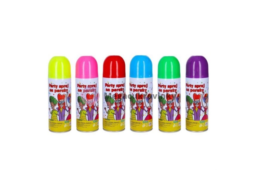 Párty sprej se používá k barvení vlasů a paruk. Sprej je omývatelný běžnými šampony. Před použitím musí mít sprej pokojovou teplotu a musí se důkladně protřepat. Stříkejte ze vzdálenosti 20 cm a umyté vlasy. Doporučený věk: 8+ Není vhodné pro děti mladší 3 let. Vždy používejte dle návodu na obalu. Uvedená cena je za 1 kus. Zvolenou variantu napište prosím do poznámky k objednávce. Pokud by jste nevybrali žádnou variantu, zasíláme náhodně dle skladové dostupnosti. Pokud Vámi vybraná varianta/barva nebude skladem, budeme Vás co nejrychleji informovat. Dostupné barvy: - Zelená, Modrá, Žlutá, Růžová, Červená, Fialová Objem 140 ml.Doplňkové parametry