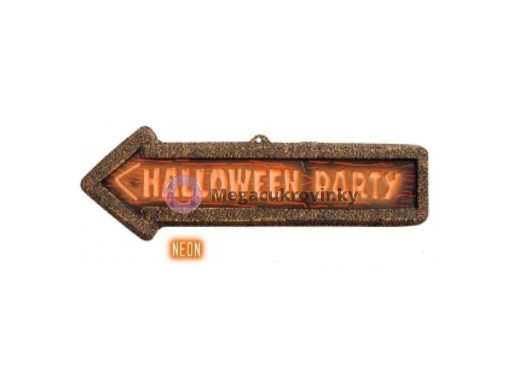 Plastová prostorová šipka ukazující směr k místu konání halloweenové párty. Neonový nápis svítí pod UV zářením. Originální svítící Halloween dekorace upozorňující vaše přátele na nejlepší párty všech dob.