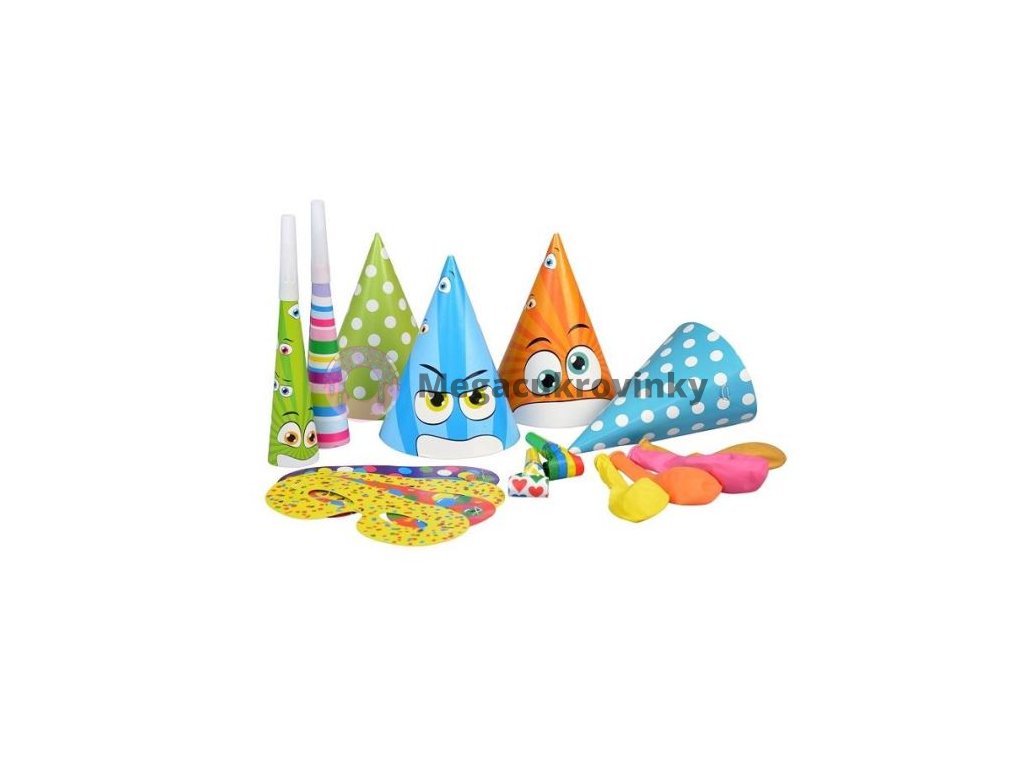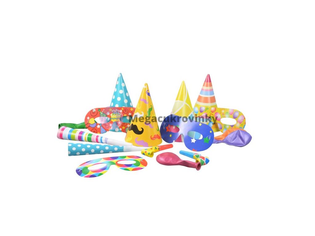 Užít si oslavu umožní párty set nejen na Silvestra, plesy, karneval. Párty sada obsahuje: 4x klobouček, 4x maska na obličej, 2x trubka, 2x píšťalka, 4x balónek Celkem obsahuje 16 ks skvělých párty doplňků.Doplňkové parametry