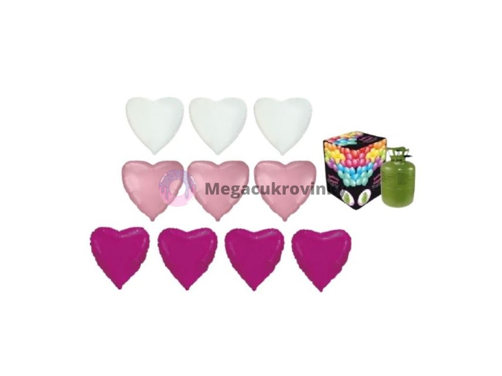 Sada obsahuje 1 ks jednorázové láhve helia (tlaková láhev o vodním objemu 7 l obsahuje 200 l stlačeného helia) + 10 ks foliových balonků ve tvaru srdce s průměrem 45 cm v barevném provedení: 3 ks pastelově růžové, 3 ks bílé a 4 ks tmavě růžové