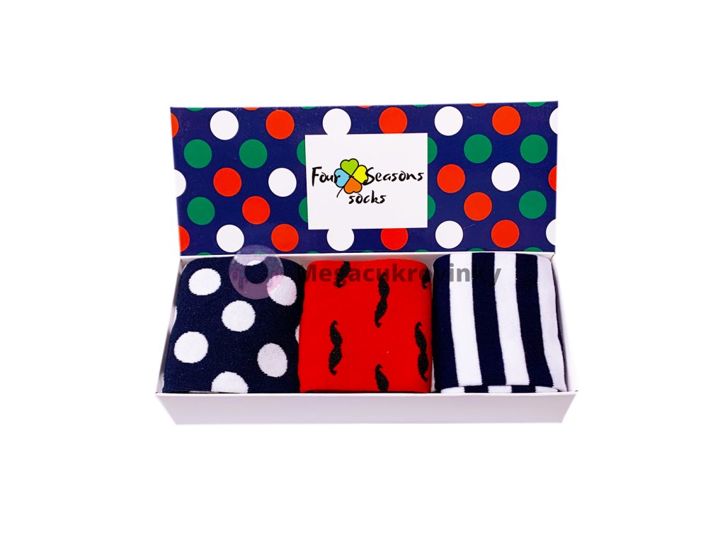 Dárková krabička s puntíky obsahuje 3 ks vybraných vzorů veselých ponožek. Vhodné jako dárek.