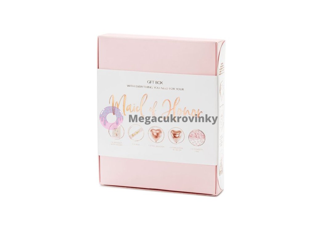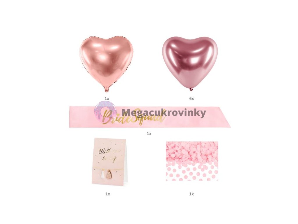 Sada pro nezbytnou výbavu nevěstiny družičky. Krabička obsahuje 1x šerpu, 1x kartičku s náramkem, 1x fóliový balónek Srdce v barvě rose gold, 6x latexový balónek Srdce v barvě rose gold, a 15g konfet ve světle růžové barvě.Doplňkové parametry
