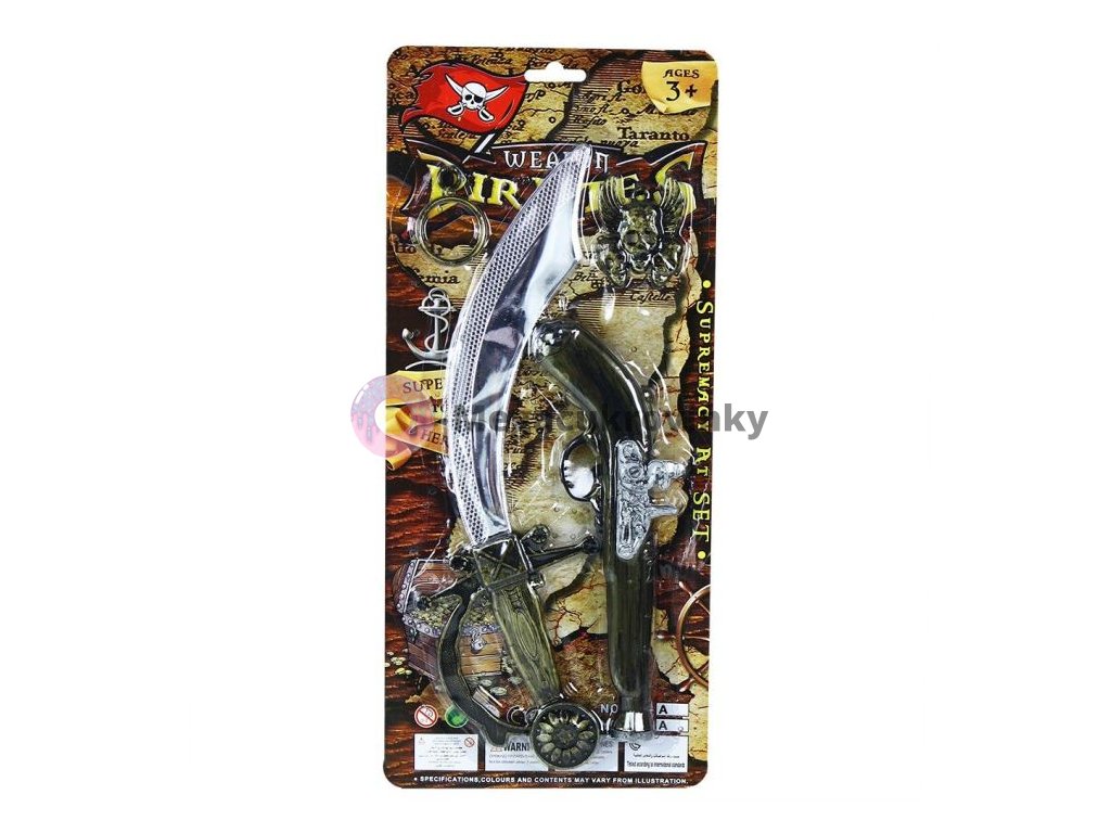 Pirátská sada pro všechny malé piráty! Set obsahuje stříbrný meč s bronzovou rukojetí, bronzovou pistoli, náušnici a pirátský přívěšek. Perfektní doplňky ke kostýmu piráta nebo jen tak na hraní!Podrobné informace o produktu získáte kliknutím .
