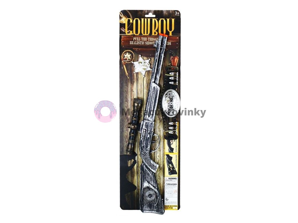 Lovecká puška nesmí chybět v žádném chlapeckém pokojíčku! Stisknutím spouště vydává puška opravdový zvuk a to bez použití baterií. Puška v imitaci kovu o délce 50 cm je vyrobena z PVC. Součástí je pásek a hvězda šerifa.Podrobné informace o produktu získáte kliknutím .